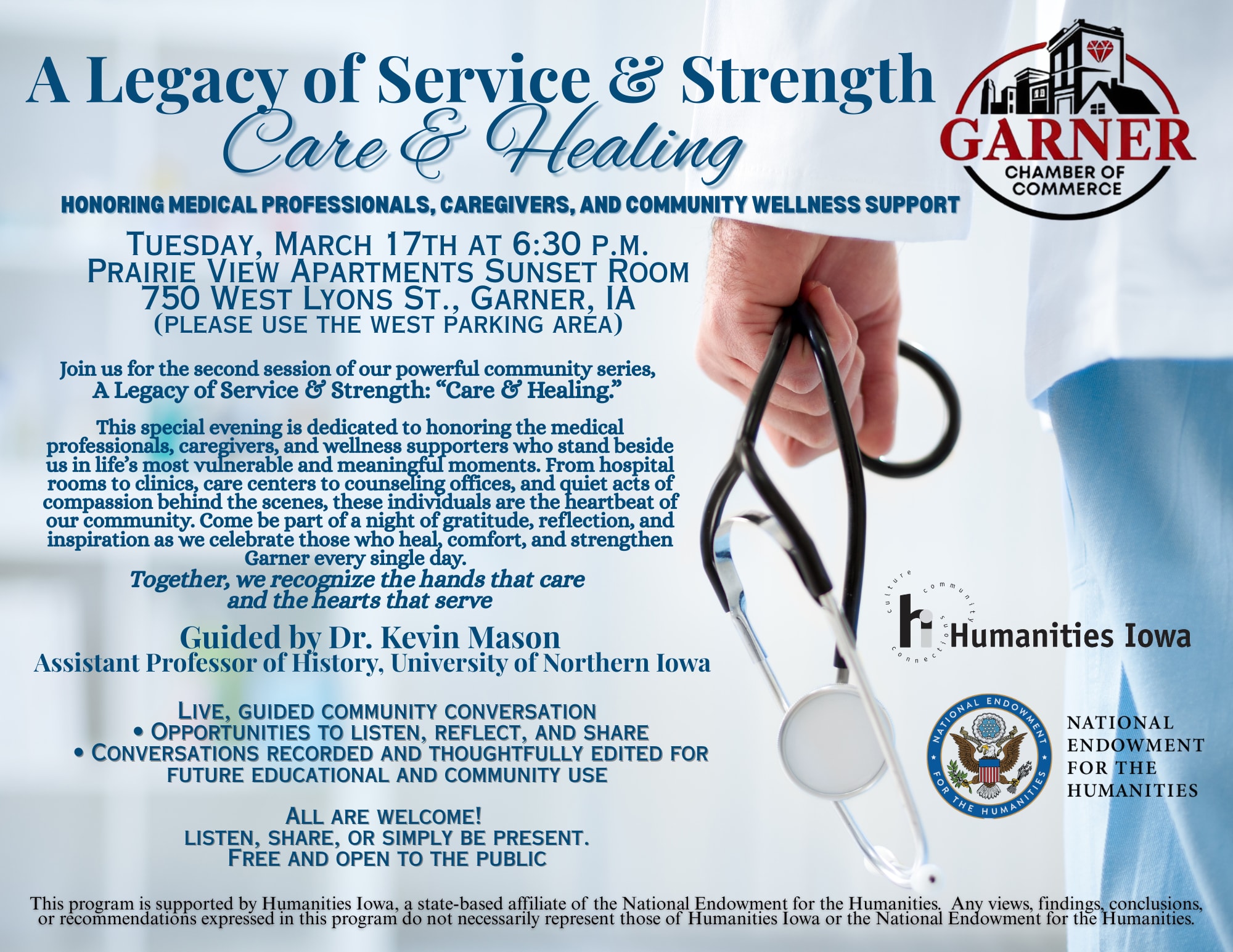 Join us for the second session of our powerful community series, A Legacy of Service & Strength: “Care & Healing.” This special evening is dedicated to honoring the medical professionals, caregivers, and wellness supporters who stand beside us in life’s most vulnerable and meaningful moments. From hospital rooms to clinics, care centers to counseling offices, and quiet acts of compassion behind the scenes, these individuals are the heartbeat of our community. Come be part of a night of gratitude, reflection, and inspiration as we celebrate those who heal, comfort, and strengthen Garner every single day. Together, we recognize the hands that care and the hearts that serveImages
